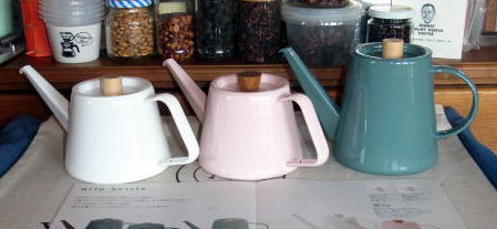 ドリップケトル Kaico 懐古・蚕 良い道具は使う度に楽しい。 このポットを使い始めてから何年経ったのか、私の最も好きで信頼しているドリップ用ポットです。 注湯量も自在に操れる、真下に雫の様に又糸の様に、更に多量に自由自在、そして始めから終わりまで安定して注湯が出来ます。ドリップ時間でも例えば1杯や2杯そして3杯を作る場合、それぞれを同じ時間でドリップするには、湯量は当然に2倍3倍の変化に対応する必要があります。また、粉の層を乱さない為には注湯の勢いは少なく、注湯の角度も粉を乱さない様にするのが良いかと思うが、こうした条件を満たすドリップポットは少ないと感じます。 ドリップ時の湯温については、このポットに限りませんが、注湯の温度では、沸騰したお湯を湯沸かしポットからサーバーやドリップポットに移す事で湯温の調整が楽になります。 更に・・・まだ有りますね・・つまり、点滴ゆっくり注湯でドリップ時間が長くなり湯温が低下した場合に、湯沸かしポットから加える事でも注湯温度の調整が出来るのです。 |
