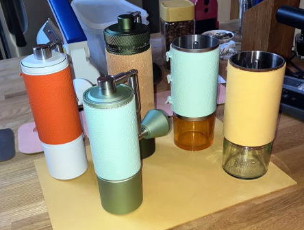 革巻きすると元の機種が何だか分からない(笑い)写真のミルは下記のとおり タイムモア・・C3s PRO /C5 PRO/S3 ・・ コマンダンテ・・・C40 MK4・C60 バラクーダ C5はお客さんが見せに店に持って来られた。刃を見て挽いて見て飲んで見て、甘さの表現が良かったので これなら買うべきと感じ、早速真似をして購入したミル。 やはり甘味が感じられるなかなかの表現でコスパも性能も優秀な様だ! ※革の追加入荷あり:オレンジ色の革が気に入ったので、探して頂き見つかりました。 これで数種の用意が出来、安心して着せ替え出来ます。興味の有るもの好きな人は是非ご覧ください。 |